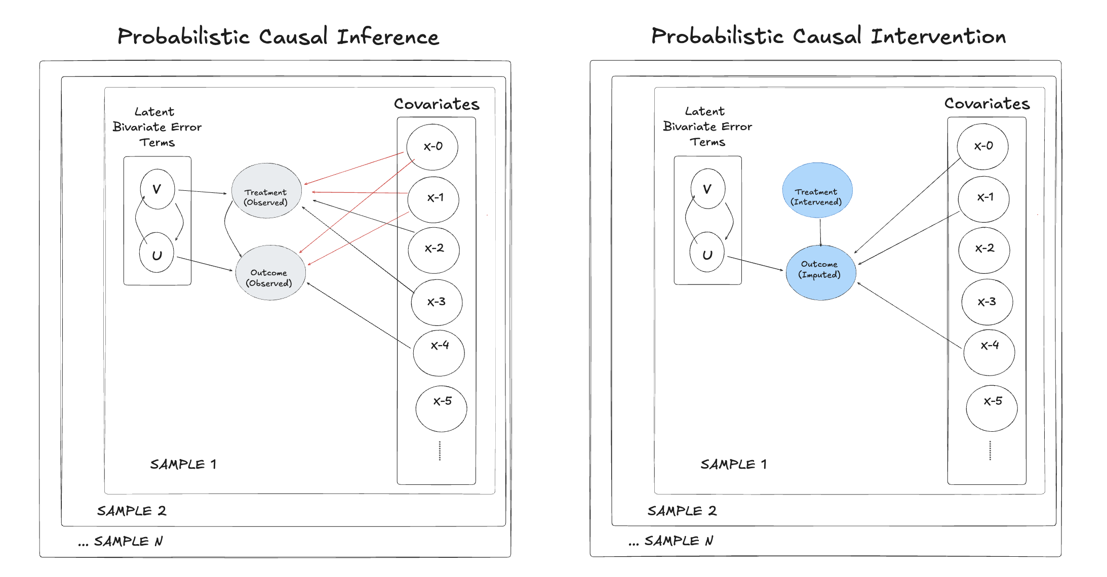 The innovative methods of inference (like Two-stage least squares, propensity score weighting or DiD designs) that came to define the credibility revolution in the social sciences, seek to overcome this risk of confounding with constraints or assumptions to bolster identification of the causal parameters. See See Angrist and Pischke [2009]. Bayesian probabilistic causal inference addresses these challenges by explicitly modelling the data-generating process and quantifying all sources of uncertainty. Rather than point estimates and design assumptions, we infer full posterior distributions over causal parameters and even over counterfactual outcomes. Rather than isolating the outcome equation from the treatment equation, we model them together as parts of a single generative system. This approach mirrors how interventions occur in the real world. The propensity for adopting a treatment can be predicted by the same factors which determine treatment outcomes. This structure creates the risk of confounding because the efficacy of the treatment is obscured by the influence of these shared predictors. When we fit such a model, we learn about every component simultaneously—the effect of the treatment, the influence of confounders, and the uncertainty that ties them together. Once fitted, Bayesian models can generate posterior predictive draws for “what if” scenarios. This capacity lets us compute causal estimands like the ATE or individual treatment effects directly from the posterior.